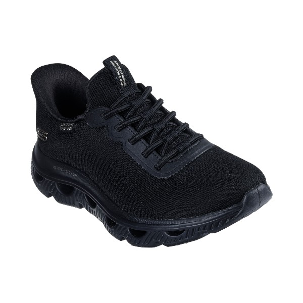 Zapatilla SKECHERS estilo sport, plana y ligera, en negro total. Upper de malla knit transpirable con cordones y ajuste tipo calcetín. Suela de goma con diseño recortado para amortiguar y flexionar con estilo. Campaña V26.